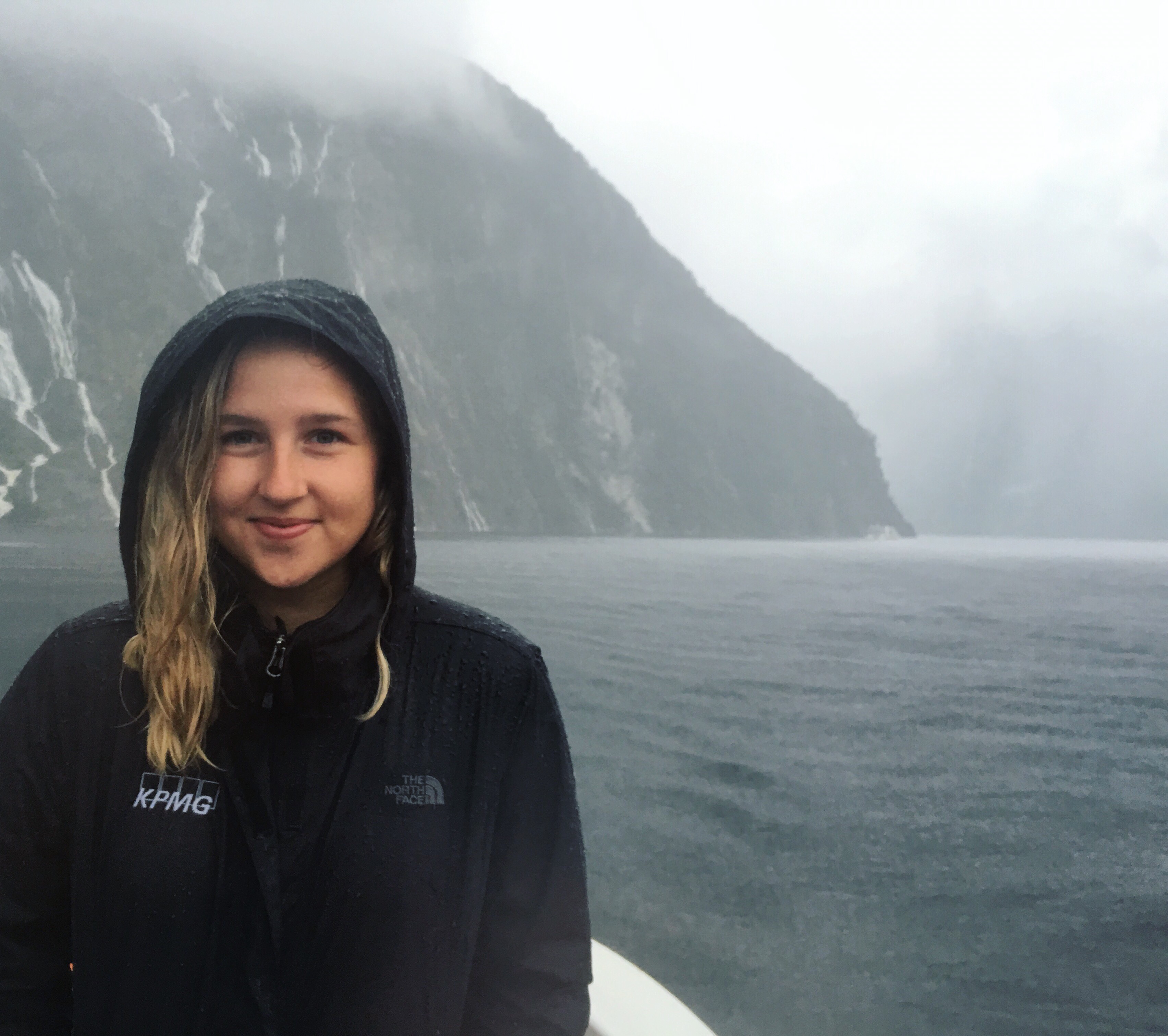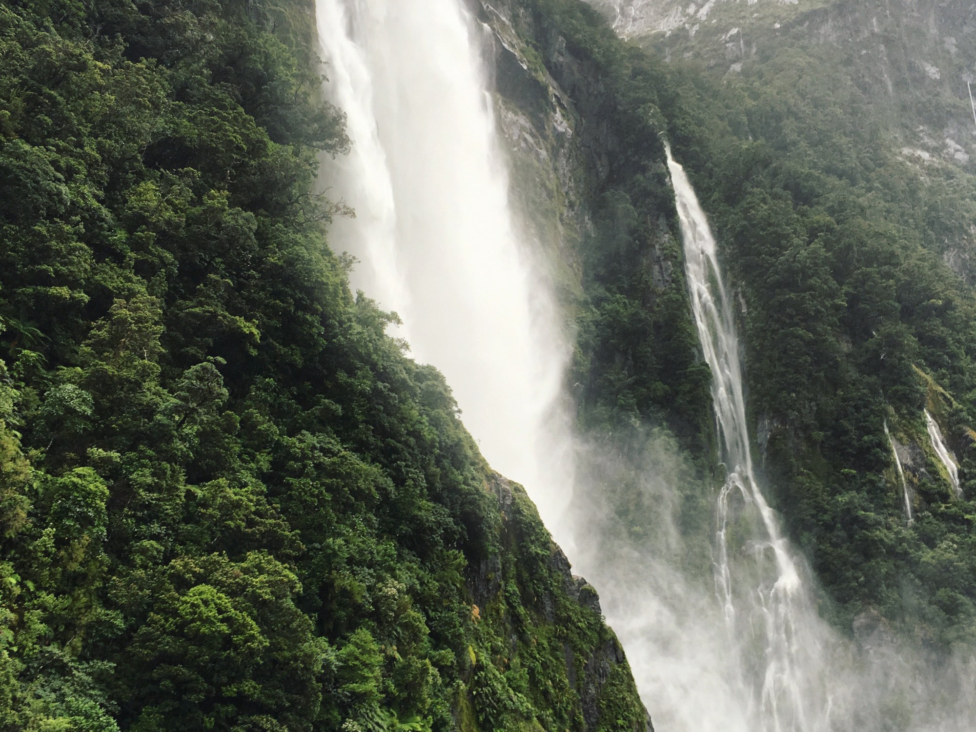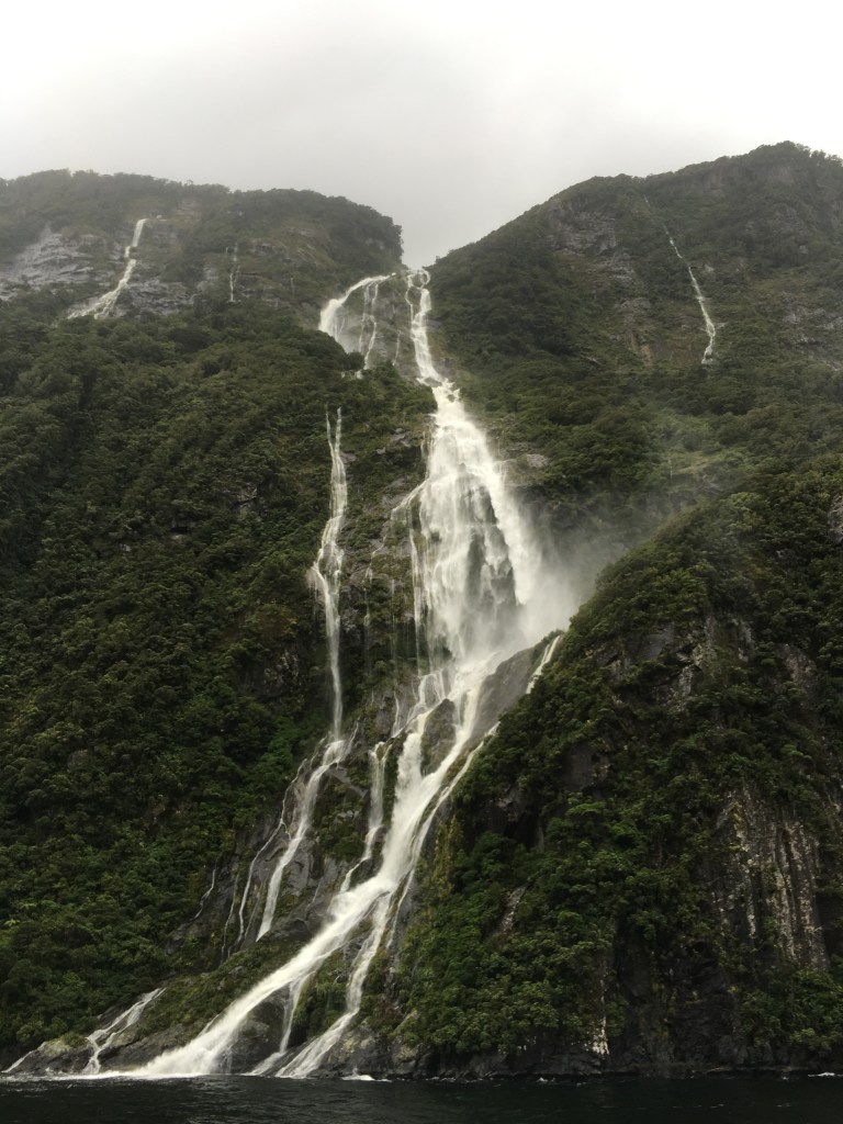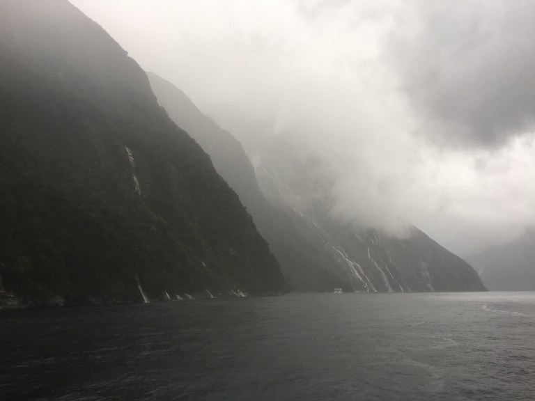 I made a really terrible choice and wore jeans with my rain coat. As we arrived we had to run to the building and even then we got soaked. We were taking a cruise to see the Milford Sound so we waited for the boat to load up. We took off on the boat and even just the start was full of water shooting off of the mountains, which we found out was all rain water and the most there had been all season. We got to see just a glimpse of Milford Sound which was still incredible through the fog and rain.