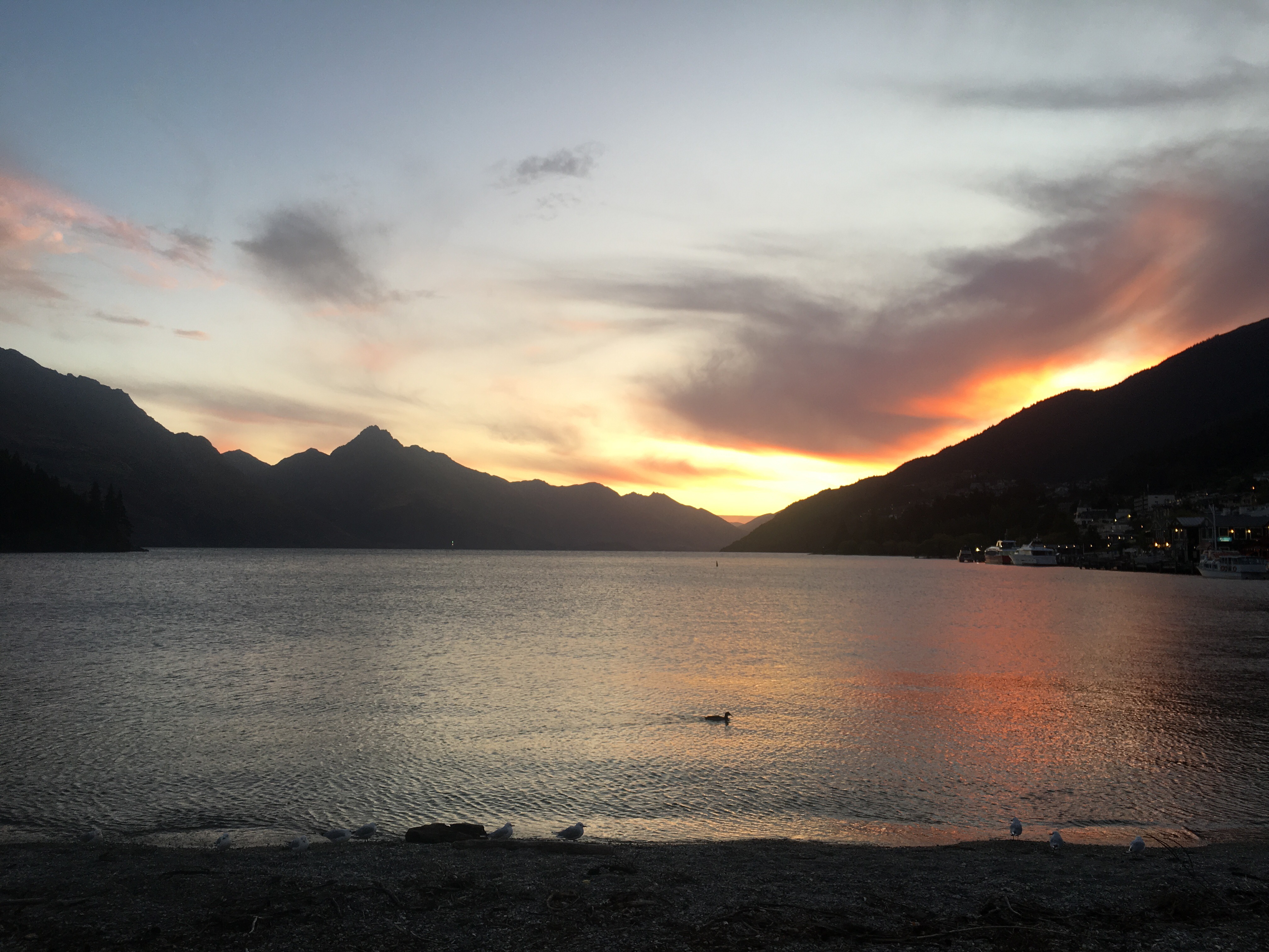 I arrived off of the bus from Wanaka and quickly walked to my hostel to avoid getting soaked by the rain. After grocery shopping I was cooking dinner when I met a guy from Israel. He was chopping onions so my eyes were watering out of my head or I was crying. (something like that). He was with two guys from Belgium and one from Italy. We had a brief conversation, I ate dinner, then headed off on a walk. I absolutely love evening walks. There is something so peaceful about wandering off without direction as the evening sets in. I ended up walking around the lake as the sun was setting.
